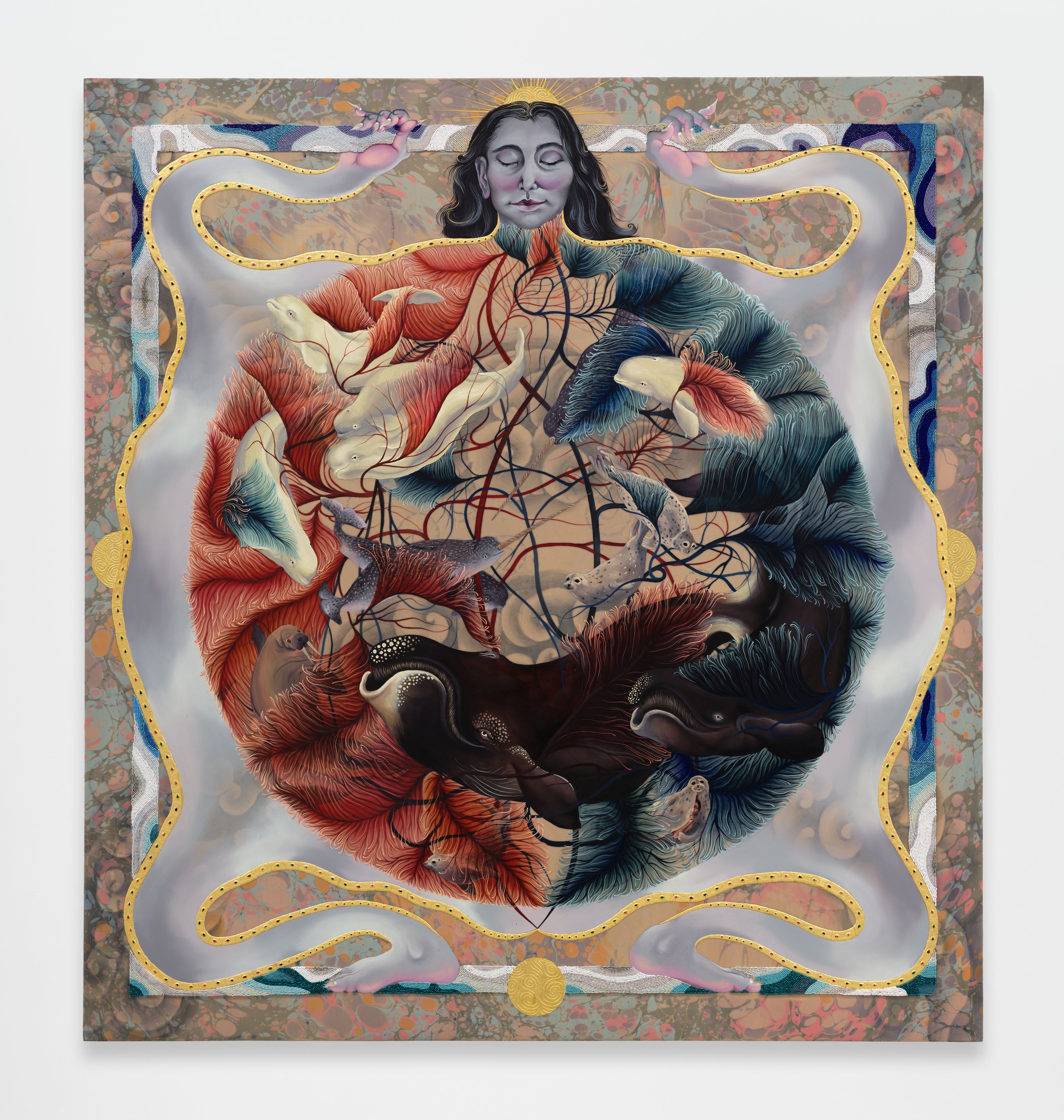 Sahana Ramakrishnan’s new paintings and sculpture at Rajiv Menon Contemporary dance upon the thresholds between worlds. Across canvases and painted panels, the exhibition weaves folklore and field research shaped by recent travels in the Arctic Circle. Ramakrishnan’s palette is anything but frigid, yet her works ruminate on the ocean as an enigmatic underworld. As mythology insists, such realms are not devoid of life, but they are bound to different laws, and largely sealed from the perceptions of the living. In polar Norway, Ramakrishnan listened via hydrophones through glacial ice to the songs of belugas, seals, and narwhals, drawn toward a dimension that was close enough to hear, but impossible to inhabit.